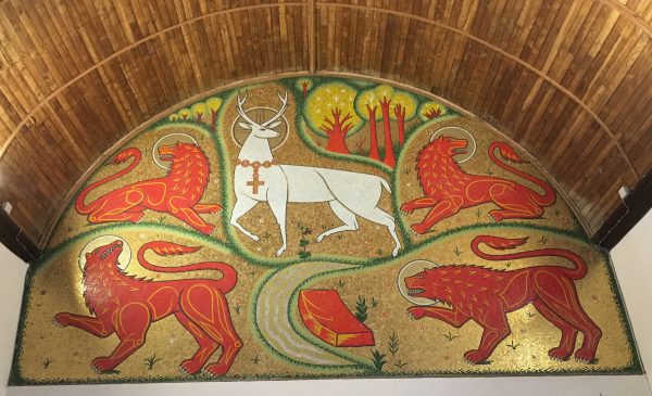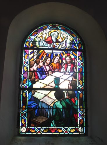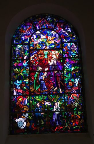 - La grande verrière représente le Christ, mort puis ressuscité visitant Joseph d’Arimathie dans sa prison. Plusieurs symboles chrétiens se mêlent aux celtiques