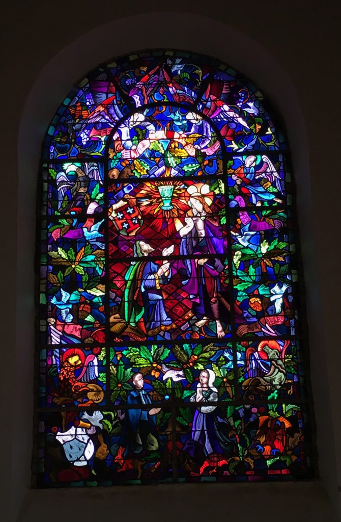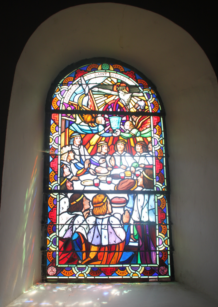 Avec le temps, l’abbé Gillard ajoute d’autres éléments symboliques dans son église. L’ajout des vitraux du chœur est pour lui une autre occasion de mettre en scène les éléments provenant de la légende arthurienne. En trois vitraux, l’abbé dévoile les mystères du Saint Graal :