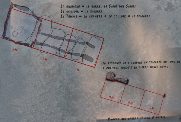 Le Tumulus de Kercado possède une composition géométrique particulière qui forme ce qu’on appelle un tricarré, comme on peut le voir sur l’image ci-dessous.