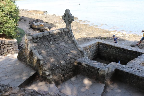 Située sur le côté Est de l’île, en contrebas de la chapelle, la fontaine de Saint-Cado est dédiée au Saint de l’île. En plus de la fontaine, deux escaliers permettent d’accéder à un bassin. L’édicule est surmonté d’une croix celtique sculptée, figurant une crucifixion.