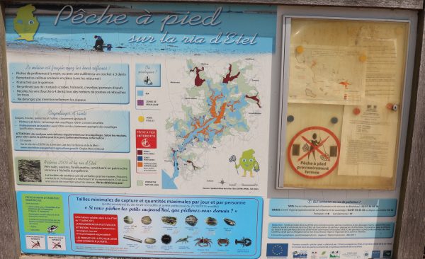 Le Ria d’Etel est l’un des endroits les plus connus en Bretagne pour la pratique de la pêche à pied. En se baladant sur les nombreux sentiers du Ria, on tombera périodiquement sur des panneaux explicatifs de cette pêche particulière et donnant les règles et recommandations à suivre.