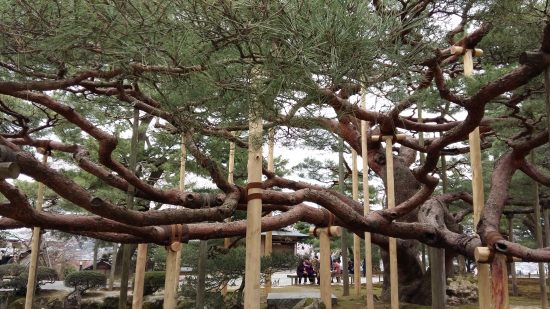 Karasaki-no-matsu, ou les Pins de karasaki, représentent l’une des curiosités des jardins. Atteignant de grandes tailles, les branches de ses arbres sont soutenues par des cordes reliées à un poteau central, les faisant ressembler à de petits chapiteaux lorsque la neige commence à tomber. En été, les plus ancien de ces pins sont également soutenus par des poteaux tant les branches sont lourdes et horizontales.