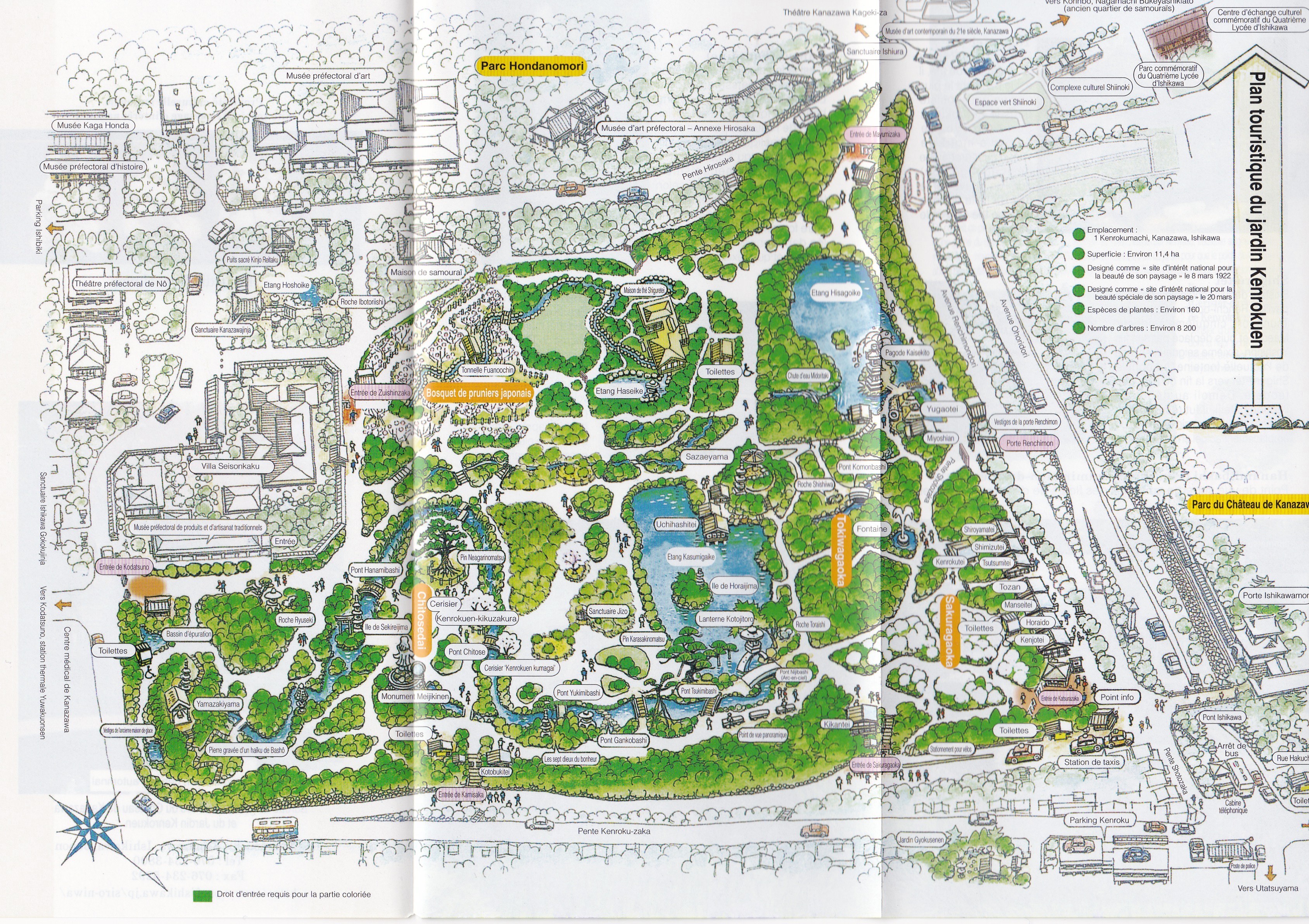 Notes de voyage : Kanazawa dénote parmi d’autres grandes villes comme Kyoto, Tokyo ou Osaka par son calme et le maintien de nombreuses traditions. La ville est connue pour ses splendides kimonos en soie Kaga-yuzen, ses laques Wajima, le théâtre Noh, ses céramiques Kutani et Ohi ou encore sa dorure à la feuille d’or (mais les prix suivent bien évidemment ces objets de qualité). Les nombreux jardins qui s’y trouvent, et plus particulièrement le Kenroku-en, représentent une halte de choix dans votre voyage tout en vous permettant de vous sortir durant quelques jours de la pollution des grandes villes.