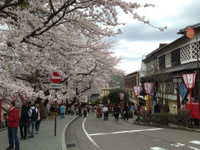 Les rues de la ville au couleurs d’Hanami avec de jolies lanternes qui éclairent les allées à la nuit tombée.