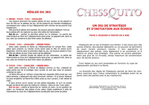ChessQuito propose ici une version très intéressante pour débuter les échecs. Rapide, facile à comprendre mais contenant tout de même tout le nécessaire pour se familiariser avec les déplacements et les diverses fonctions des pièces, ce jeu est également de très bonne qualité au niveau des éléments qui le composent. Les parties sont rapides et permettent de ne pas perdre les jeunes joueurs et les débutants lors d’interminables parties. A recommander pour les néophytes du genre qui désirent s’initier à ce jeu.