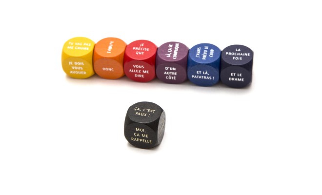 Celui qui raconte lance ensuite le dé-connecteur jaune, qui lui donnera le début de son histoire – par exemple « tu vas pas me croire ». A lui ensuite d’inventer son histoire, en se servant si besoin des autres dés-connecteur (dans l’ordre du plus clair au plus foncé).