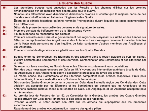 Pour ce chapitre, c’est très simple, il suffit d’énumérer les principaux éléments qui surviennent dans l’histoire de son univers. De cette manière, on possède un outil qui nous permet d’avoir une définition sommaire de l’univers, ainsi que des points importants qui peuvent donner des idées pour la construction d’un scénario. Par la suite, cela donne également une idée de la période dans laquelle les personnages évoluent et les éléments qui pourront influence la campagne qu’ils sont en train d’effectuer. Voici un extrait de cette chronologie qui provient de mon guide d’univers, histoire de donner une idée de ce que cela donne au final.
