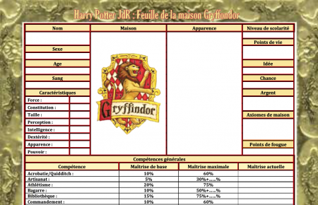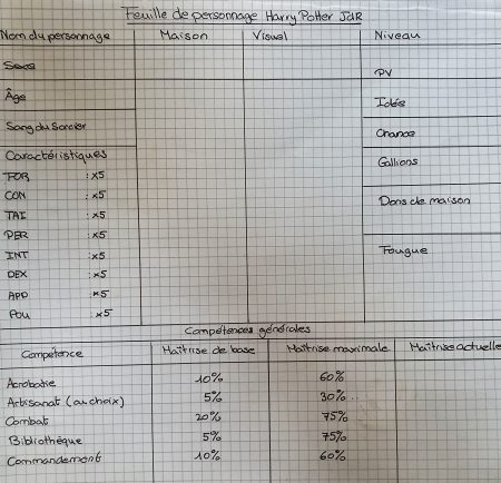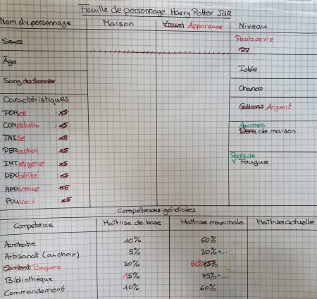 Pour reprendre notre exemple Harry Potter JdR, l’avancement de la création et la définition de nouvelles compétences nous donne quelques corrections sur la feuille de personnage de base.