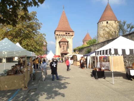Un petit marché médiéval se tenait sur la place devant le château et permettait de flâner un peu avant d’entrer dans Estavayer 1470 à proprement parler. Deux bénévoles habillées en moines tenaient très efficacement les caisses de l’entrée, nous n’avons absolument pas eu besoin d’attendre.