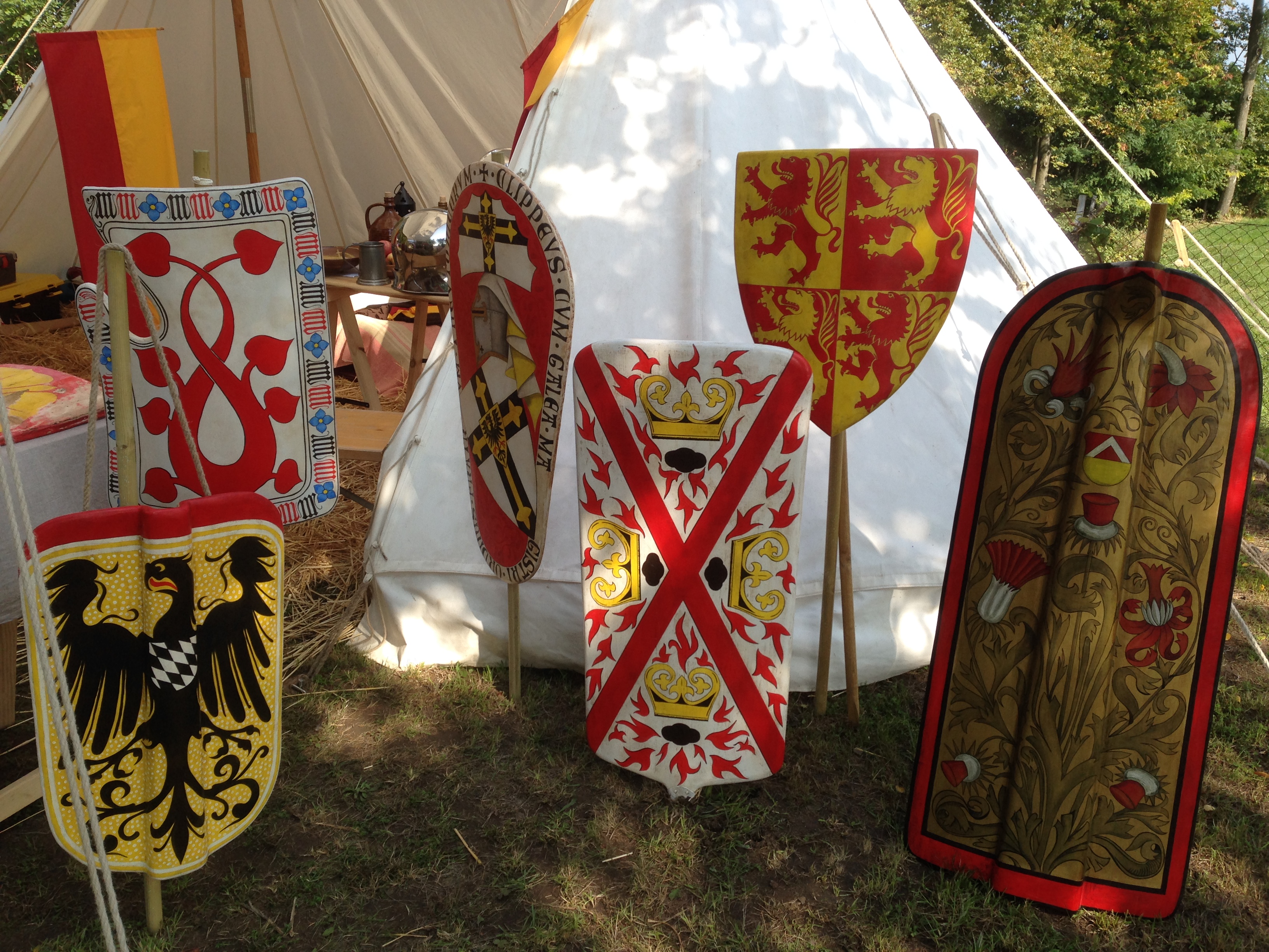 Les amateurs de boucliers d’époque ne pouvaient que s’arrêter à ce stand haut en couleurs. Non seulement on pouvait y apprendre les bases de la création et de la lecture de blason (couleurs, découpe, etc.), mais on s’y instruisait également sur leur importance sur les boucliers, ainsi que la manière de restaurer ces derniers lorsqu’ils se faisaient malmener lors de tournois