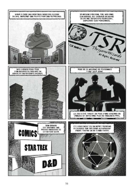 Mikaua : J’ai beau être joueuse vétéran de D&D, je dois dire qu’au-delà de son nom, je ne savais pas grand-chose de son créateur. Avec l’Éveil du maître du donjon, j’ai pu largement étoffer mes connaissances sur Gary Gygax en particulier, et sur la création de D&D en particulier. Le style de narration « à la maître du jeu » surprend au début, mais les rôlistes retrouveront rapidement leurs marques, et les profanes n’auront besoin que de quelques pages de plus pour s’y faire ; au fond, un maître du jeu, c’est en essence un conteur qui vous raconte une histoire – la différence est que vous avez le droit d’intervenir et que la suite de l’histoire va dépendre de vos actions. Le dessin est simple, uniquement en noir et blanc. Il y a assez peu de mouvement dans les cases, donnant l’impression d’une succession de plans fixes qui demande également un temps d’adaptation mais qui donne au final l’impression un peu étrange mais pas désagréable d’avoir regardé un documentaire en bande-dessinée. Plus accessible qu’un texte « sec », l’éveil du Maître du donjon permet aux rôlistes comme aux simples intéressés d’en apprendre davantage sur Donjons et Dragons, ainsi que sur son créateur.