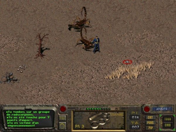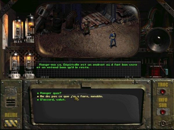 Wile Cranky Coyote : Fallout est vraiment un excellent jeu et très intéressant par-dessus le marché. Ça se pose comme un jdr classique, mais en jeu-vidéo en temps réel. Au début de la partie, on crée un perso, on distribue les points de carac (qui définissent les niveaux des compétences), on choisit 0, 1 ou 2 traits (agilité + 1, mais les différentes parties du corps sont plus fragiles, +5 à toutes les compétences, mais -10% de pex gagnés, …) et on se lance dans une grande aventure au milieu du désert du Mojave (prononcer morave).
