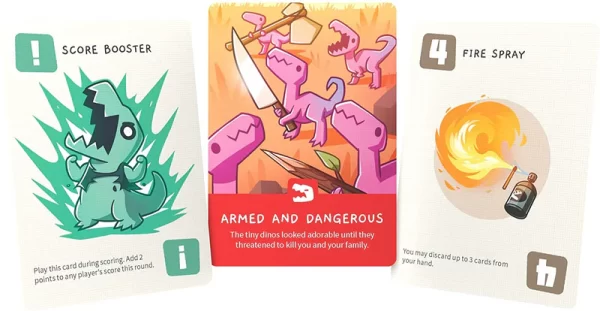 Keul : comme beaucoup de jeux de la série Unstable Games, Happy Little Dinosaurs peut sembler simple de prime abord, mais s’avère bien plus complexe qu’on ne pourrait l’imaginer une fois commencé. Les possibilités de combos entre le personnage choisi, les cartes jouées et les effets des différentes catastrophes sont importants et peuvent complètement retourner une partie en quelques rounds pour peu qu’on tire les bonnes carte. Le design du jeu est tout mignon et l’humour noir très présent. Un très bon jeu, simple à prendre en mains et dont le temps de jeu permet des parties rapides et dynamiques.