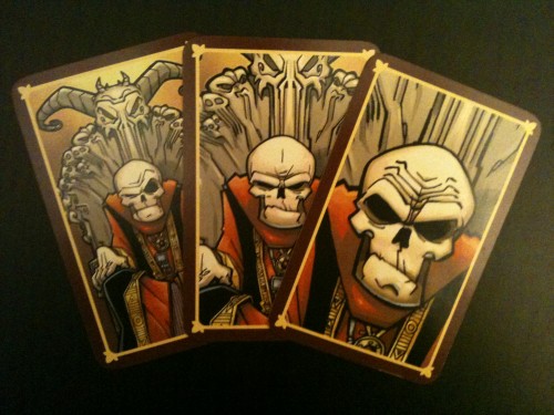 Si l’excuse ne convint pas, que le joueur bégaie, manque de respect au Maître, ou qu’il ne trouve rien à dire, il récolte un regard noir de la part du Seigneur des Ténèbres. Un regard noir est un avertissement qui signifie que votre Seigneur tout puissant commence à douter de vous. A trois regards noirs, c’est une mort imminente qui vous attend, à moins que la chance soit avec vous. En effet, vous pouvez tenter de tirer une carte et, si l’œil de Rigor Mortis s’y trouve, alors vous êtes mort. Au cas contraire, vous obtenez une seconde chance. De quoi faire durer le plaisir… ou votre torture.