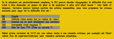 Basiquement, un jet de dé est réalisé avec un d6, soit un dé à six faces. Une action possède une certaine difficulté représentée par un nombre. Plus ce nombre est petit et plus la difficulté est grande car, pour réussir une action, il faudra effectuer un jet en dessous de cette valeur. Une action avec une difficulté de 2 signifie donc qu’il faudra faire un résultat égal ou inférieur à 2 en lançant le d6, par exemple. Par la suite, plus la difficulté augmente et plus le nombre de face du dé à lancer augmente. On passera ainsi à des d8, d10 voire même, dans les cas les plus poussés, à des d12 ou d20.