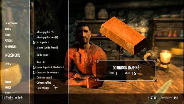 L’un des éléments qui vous prendra certainement le plus de temps dans ce jeu est la gestion de votre équipement. Petit exemple. On sort du tutoriel et on va à la première ville chercher de l’aide et les avertir que les dragons sont revenus. Le forgeron nous file quelques objets et nous redirige sur la cité capitale de la région : Blancherive. En sortant on fait un PETIT tour de la ville (petit : on n’entre pas dans toutes les maisons) et on se dit que ça serait bien de vendre les objets totalement inutiles qu’on a ramassé durant le tutoriel comme un boulimique à un buffet gratuit (je trouve cette métaphore très réaliste), à savoir : balai, seau, parchemin, os d’animaux, 4 armures de cuir impériales et 3 armures de cuir de vendeaume, 5 épées longues, 2134312 livres divers et variés qu’on aurait juste put lire et laisser sur place, mais qu’on a pris alors que ça vaut 1 pièce d’or,…